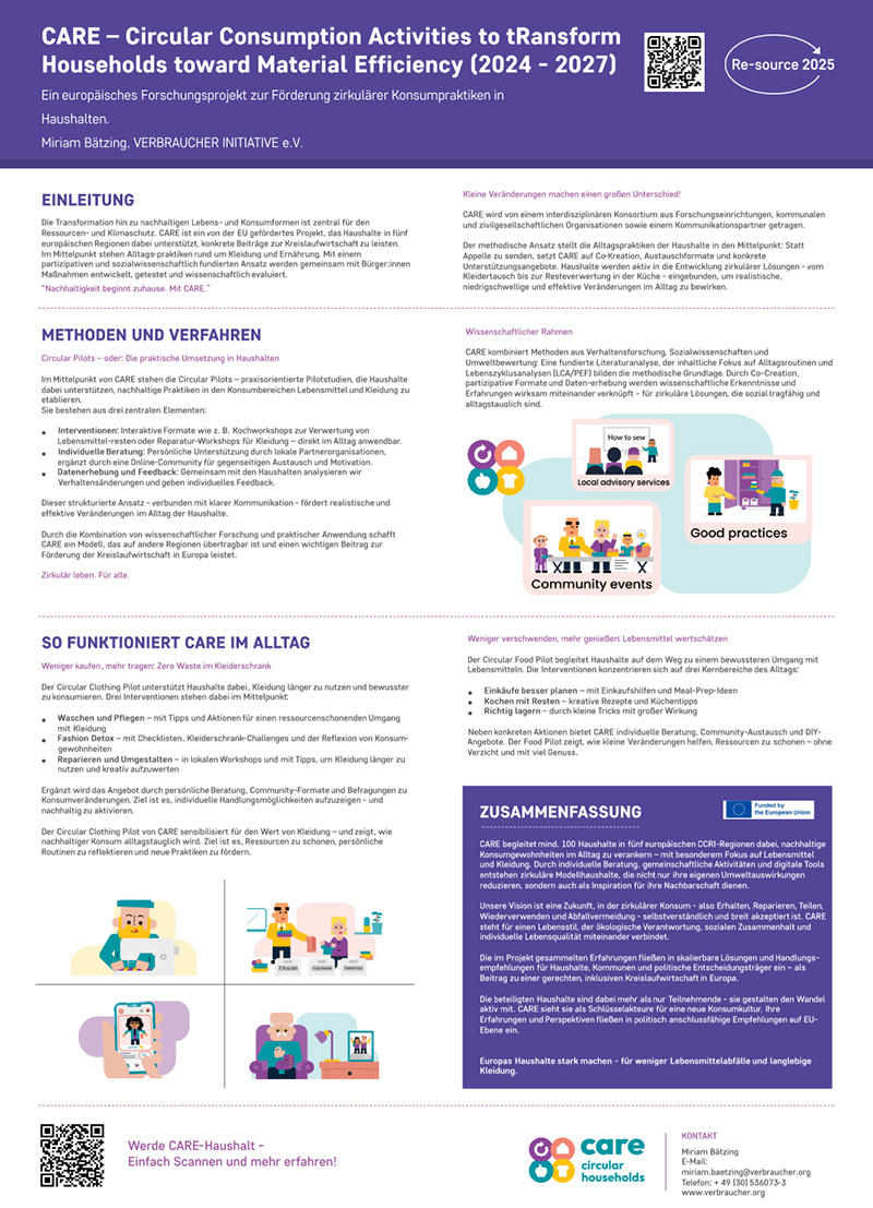 Die Transformation hin zu nachhaltigen Lebens- und Konsumformen ist zentral für den Ressourcen- und Klimaschutz. CARE ist ein von der EU gefördertes Projekt, das Haushalte in fünf europäischen Regionen dabei unterstützt, konkrete Beiträge zur Kreislaufwirtschaft zu leisten. Im Mittelpunkt stehen Alltags-praktiken rund um Kleidung und Ernährung. Mit einem partizipativen und sozialwissenschaftlich fundierten Ansatz werden gemeinsam mit Bürger:innen Maßnahmen entwickelt, getestet und wissenschaftlich evaluiert.