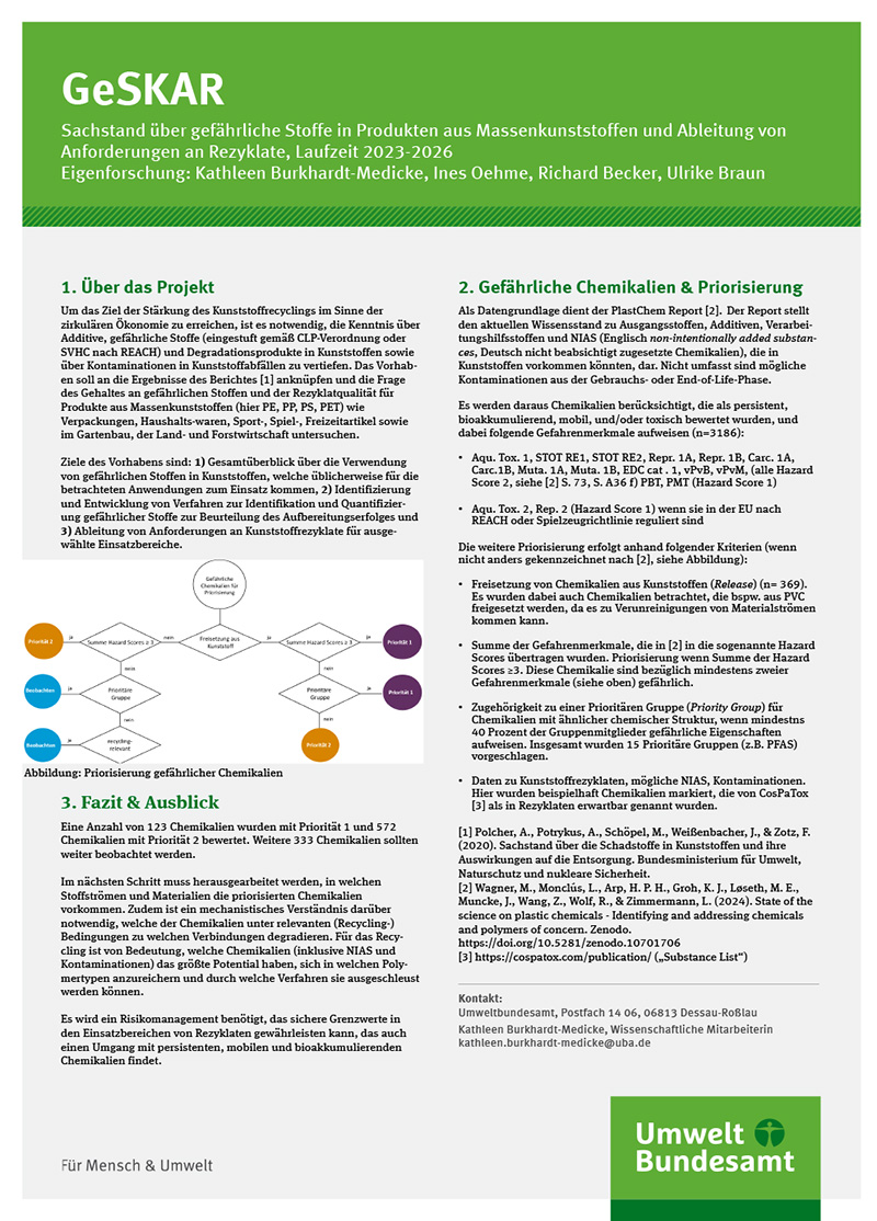 Um das Ziel der Stärkung des Kunststoffrecyclings im Sinne der zirkulären Ökonomie zu erreichen, ist es notwendig, die Kenntnis über Additive, gefährliche Stoffe (eingestuft gemäß CLP-Verordnung oder SVHC nach REACH) und Degradationsprodukte in Kunststoffen sowie über Kontaminationen in Kunststoffabfällen zu vertiefen. Das Vorhaben soll an die Ergebnisse des Berichtes [1] anknüpfen und die Frage des Gehaltes an gefährlichen Stoffen und der Rezyklatqualität für Produkte aus Massenkunststoffen (hier PE, PP, PS, PET) wie Verpackungen, Haushalts-waren, Sport-, Spiel-, Freizeitartikel sowie im Gartenbau, der Land- und Forstwirtschaft untersuchen.