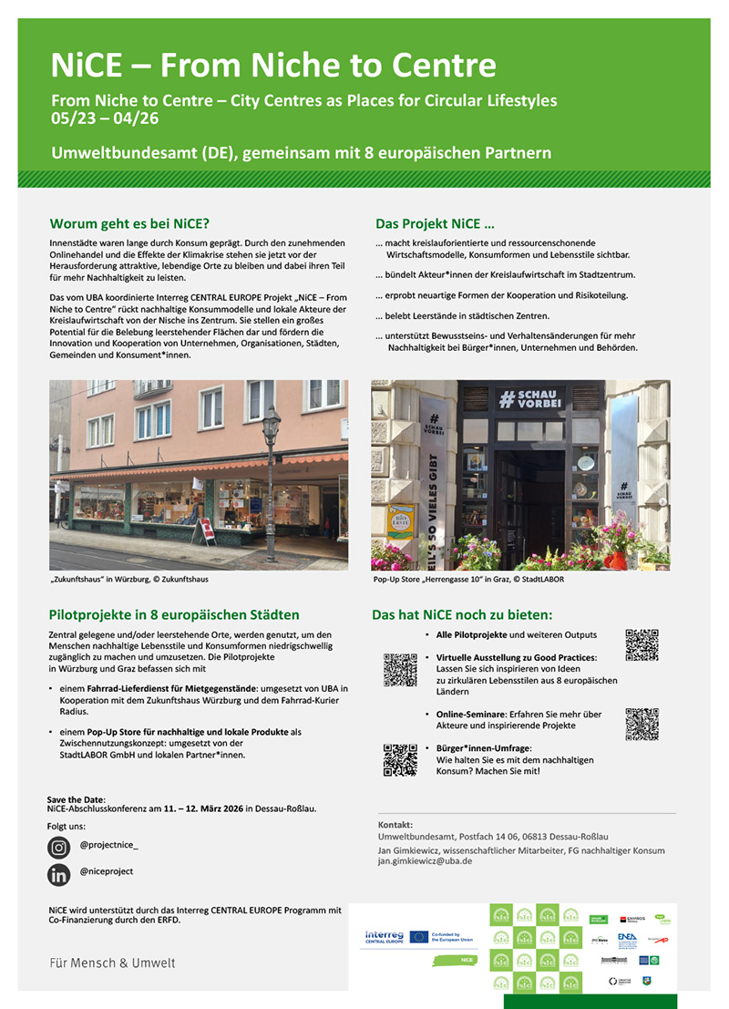 Das vom UBA koordinierte Interreg CENTRAL EUROPE Projekt „NiCE – From Niche to Centre“ rückt nachhaltige Konsummodelle und lokale Akteure der Kreislaufwirtschaft von der Nische ins Zentrum. Sie stellen ein großes Potential für die Belebung leerstehender Flächen dar und fördern die Innovation und Kooperation von Unternehmen, Organisationen, Städten, Gemeinden und Konsument*innen.